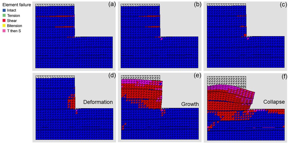 Elasto-plastically analyzed element failure and deformation in (a) 0%, (b) 20%, (c) 40%, (d) 60%, (e) 80% and (f) 90% strength decreased conditions in shale slope. Alam et al., 2025. Discover Geoscience, 3: 118. https://doi.org/10.1007/s44288-025-00226-2 |